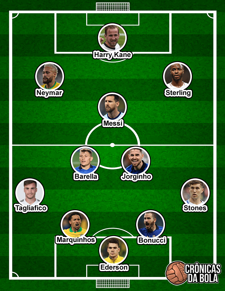 Titulares: Ederson (BRA); Tagliafico (ARG); Marquinhos (BRA) e Bonucci (ITA); Stones (ING); Barella (ITA), Jorginho (ITA) e Messi (ARG); Neymar (BRA), Sterling (ING) e Harry Kane (ING).